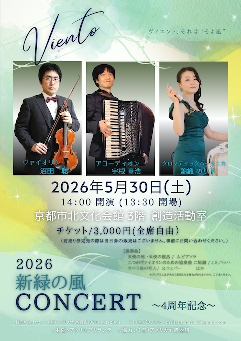 【出演】ヴァイオリン 沼田聡/ クロマティックハーモニカ 錦織のり子/ アコーディオン 宇根章浩